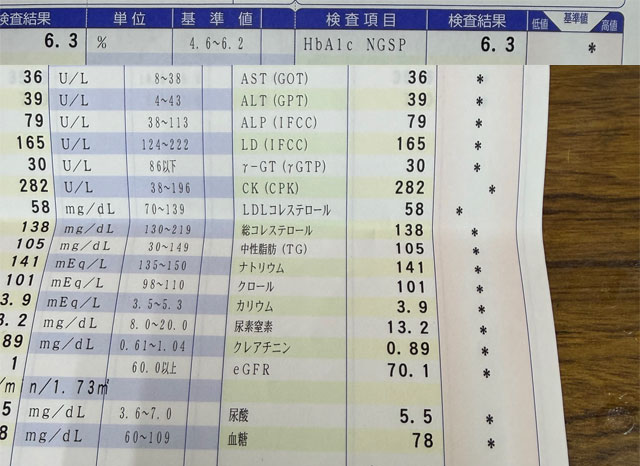 ヘモグロビンA1cが0.1超えている以外は、ほぼ基準内に入りました。